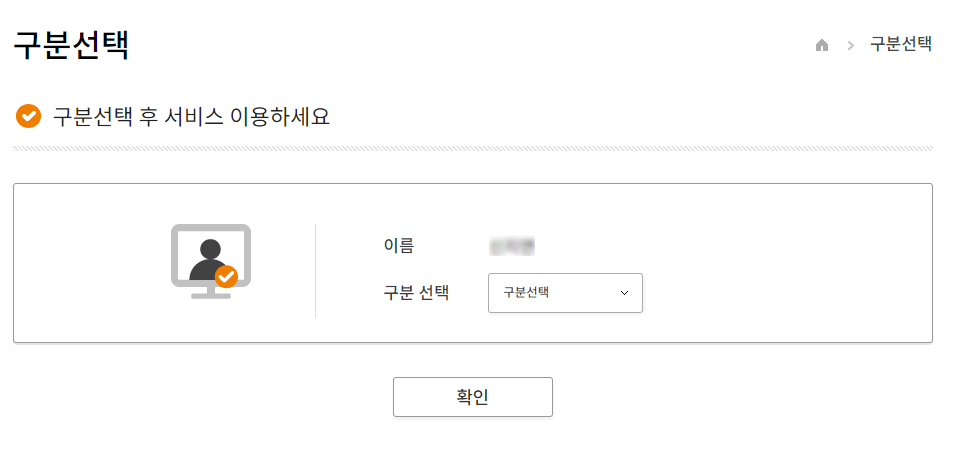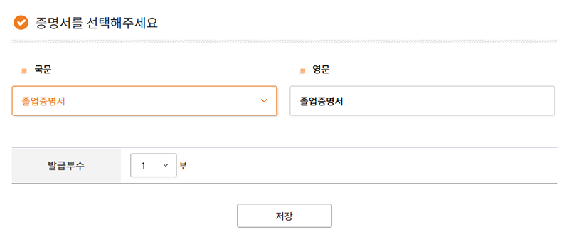 로그인 후 증명서발급 메뉴에서 위 [구분선택] 과정을 선택하시고 확인 버튼을 클릭하세요
