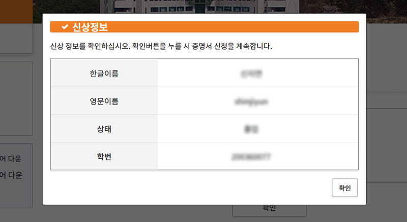 사용자에 대한 신상 정보창이 나타나며, 표시된 정보가 맞는지 확인하시고 [확인] 버튼을 누릅니다
