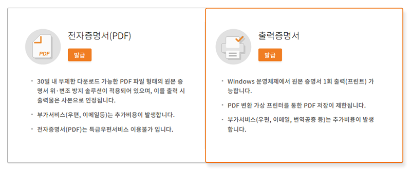 결제방법(신용카드, 핸드폰 등 )을 선택하여 결제완료 후 [증명서보관함]에서 발급된 증명서를 바로 출력가능합니다