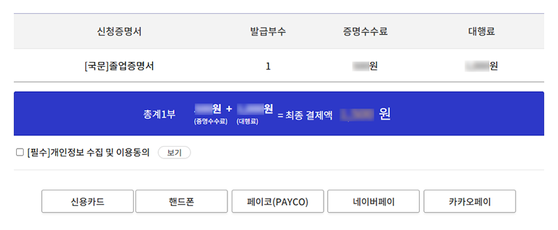 발급할 증명서의 발급료및 대행수수료가 최종결제금액으로 표시가 됩니다