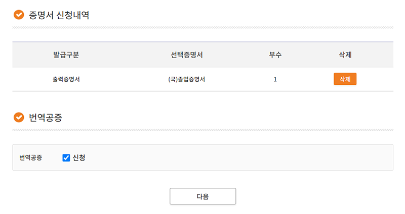 필요증명서 모두 선택 후 신청내역리스트에서 [다음] 버튼 클릭 하세요