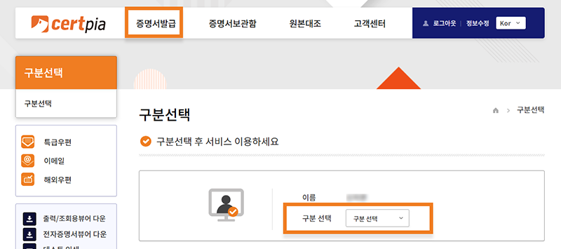 • ③로그인 후 상단메뉴에서 증명서발급메뉴 클릭 하시면 개인신상별 구분선택