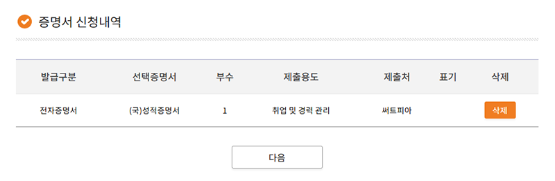 • ⑤발급받을 증명서 부수와 용도 제출처를 입력하고 저장시 하단 증명서신청내역 부분에 신청한 증명서 내역확인 후 다음클릭