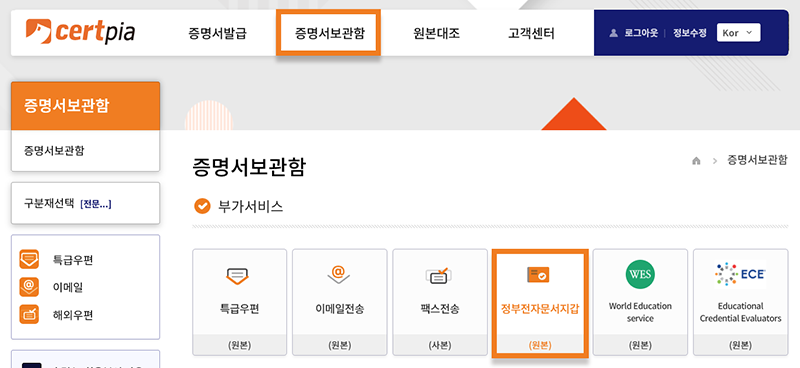 • ⑦상단메뉴에서 증명서보관함메뉴 클릭 발급목록내역에서 증명서 선택 후 정부전자문서지갑 클릭